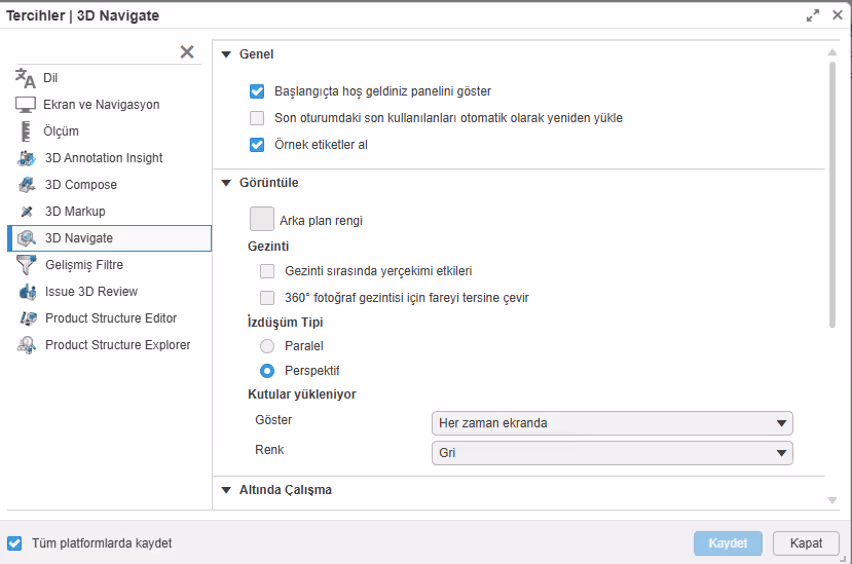 Tercihler Açılan “Tercihler” sayfasında sol baremden “3D Navigate” seçelim ve istediğimiz değişiklikleri yapalım. Resimde varsayılan ayarlar görülmektedir.