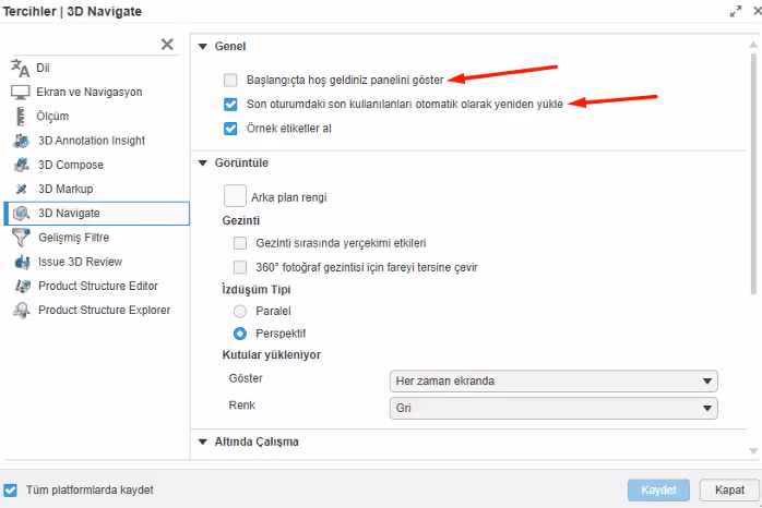 3DEXPERINECE'da 3DNAVIGATE Son Görünüm ve Tercih Ayarları