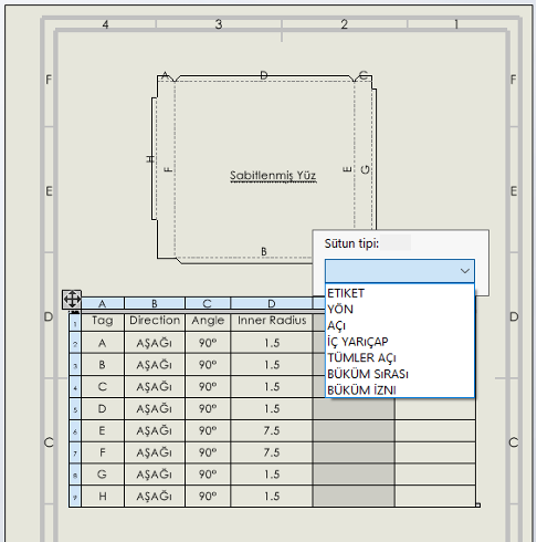 Öncelikle bir bükümlü yapılmış bir sac parçamızdan teknik resim alarak düz çoğaltma görünümünü ve büküm tablosunu ekleyerek hızlıca bir teknik resim hazırlayalım. Daha sonra kaydetmek istediğimiz tablo düzenlemesini yapalım.