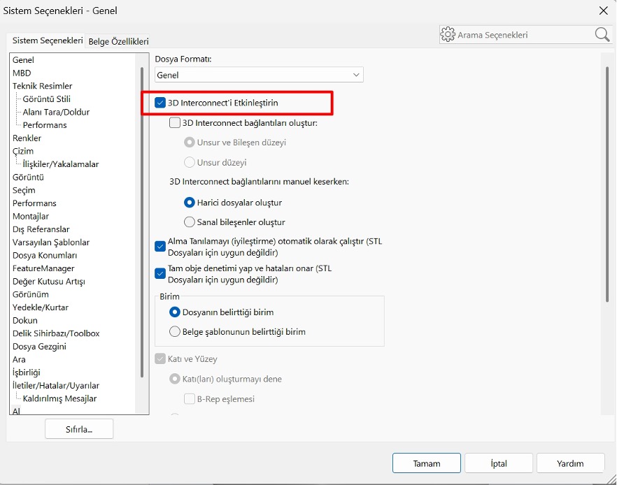 Eğer yukarıda gördüğünüz hatayı alıyorsanız bu hata SOLIDWORKS’ün alma ayarlarından kaynaklandığını anlayabilirsiniz. Çözüm için Sistem Seçenekleri>Al>Enable 3D Interconnect seçeneğine giderek bu seçeneği aktif hale getiriyoruz.