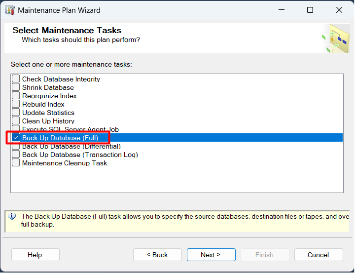 - Full backup alacağımız için Backup Database (Full) seçiyoruz.