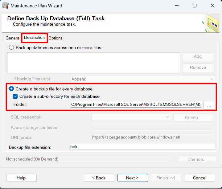 - “Destination” sekmesinde Her bir veri tabanı için bir alt klasör oluşturacağını belirtiyoruz.