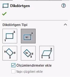 Çizim açılarak çizgi, daire, dikdörtgen, 3noktalı yay veya düz yuva herhangi biri seçilerek açılır. Açılan pencerede ölçümlendirmeler ekle seçeneğin seçimi sağlanılır. Bu çizim araçlarından çizgi, daire, dikdörtgen, 3noktalı yay ve düz yuva seçeneklerinin hepsinde ayrı ayrı düzenleyebilmektesiniz. Bu özelliğin seçimi sağlanılarak çizim yapılır.