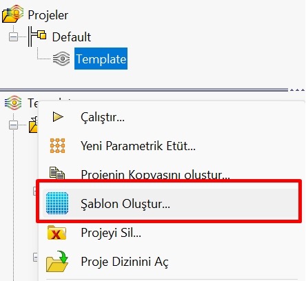 Şablon olarak kaydetmek istediğiniz analiz çalışmasının ismine sağ tıkladıktan sonra şablon oluşturma komutuna ulaşabilirsiniz.
