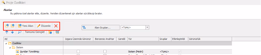 Görselde kutu içerisinde yer alan butonlararacılığıyla; yeni sekme oluşturma, klasör ekleme, yeni alan tanımlama, seçilialanı düzenleme ve seçili alanı silme işlemleri gerçekleştirilebilir. Buseçenekler, alan yönetimini daha esnek ve düzenli bir şekilde yapılandırmanızaolanak tanır.