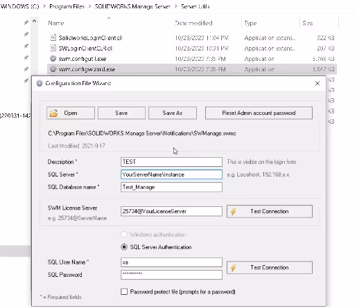 Hizmetler PenceresiSOLIDWORKS Manage bildirim hizmeti sorununu gidermek için:1. Sunucudan ‘Manage’ (Yönet) > ‘Admin’ (Yönetici) > ‘E-postalar’ bölümünü açın. Bu konumdan hata almadan test e-postaları gönderebilir misiniz?2. ‘Yönetici’ > ‘Denetleme izi’ > ‘Bildirimler’ bölümüne gidin ve bir e-posta göndermeyi deneyin.3.swmc dosyasının hizmet klasöründe olduğunu ve doğru şekilde yapılandırdığınızı doğrulayın.a. Swmc dosyasını açmak için Server Utils klasöründeki swm.configwizard.exe dosyasını kullanın.Konfigürasyon sihirbazı varsayılan olarak bu konuma yüklenir: C:\Program Files\SOLIDWORKS ManageSunucu\Sunucu yardımcı Programlarıb. Aşağıdakini girin:• Tanımı Yönet• SQL Server adı• SQL veritabanı adı• SWM Lisans Sunucusu• SQL kimlik bilgileriArdından her iki bağlantıyı da test edin.