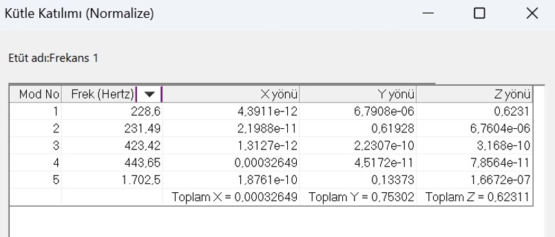 Komuta girdiğinizde her eksende rezonans frekansları ve en alt satırda da her eksendeki kütle katılım oranları yazmaktadır.