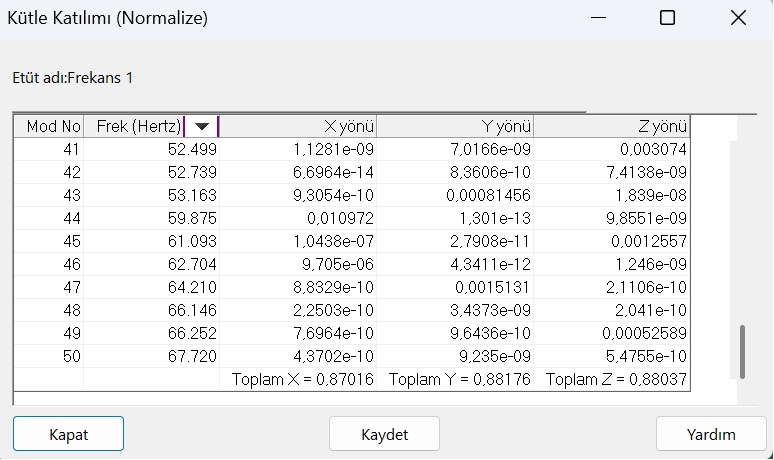 Yukarıdaki görselde görünen frekans mod sayısını 50 yaparsanız her eksende elde edeceğiniz kütle katılımı artacaktır. Ancak bu sayı her analiz için geçerli değildir. Üzerinde çalıştığınız data için 10 mod sayısı bile yeterli olabilir.