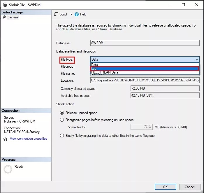 SOLIDWORKS PDM, bir veritabanı dosyası (.mdf) ve en az bir işlem günlüğü dosyası (.ldf) oluşturan veritabanı motoru olarak SQL kullanır. Veri tabanı dosyası, veri tabanına eklenen fiziksel verileri depolar ve işlem günlüğü, veri tabanı değişikliklerinin kayıtlarını tutar. Varsayılan olarak, bir SQL veri tabanının kurtarma yöntemi"Tam" olarak ayarlanmıştır. Tam kurtarma modeli ayarlandığında, birişlem günlüğü disk alanı dolana kadar büyüyebilir ve bu da Microsoft SQL Server veri tabanınızı kullanılamaz hale getirebilir. Aşağıdaki belge, veri tabanı kurtarma modunuzu "Tam" dan "Basit" e nasıl değiştireceğinizi adım adım açıklayacaktır.