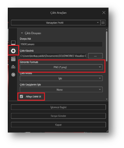 Visualize ortamında hazırladığınız çalışmayı arka planı şeffaf yaparak, yani ortadan kaldırarak render almanız mümkündür. Bunu için Ortamlar sekmesine gelerek kullandığınız ortam dosyasının üzerine tıkladıktan sonra alt kısımda beliren menülerden arka plan türünü Renk olarak ayarlayarak rengi siyah yapıyoruz. Daha sonra Output menüsünü açtıktan sonra açılan pencereden görüntü formatını PNG (*.png) olarak ayarlıyoruz ve alt kısımda yer alan Alfayı Dahil Et seçeneğini aktif ederek render alma işlemini başlatıyoruz. Bu şekilde aldığınız çıktıların arak planları şeffaf olacaktır.
